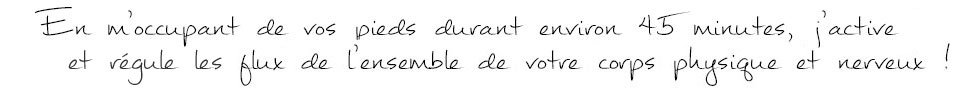 Une séance de réflexologie plantaire, c'est d'abord la garantie d'une sensation immédiate de légèreté et d'une relance de la circulation dans vos membres inférieurs. Les mêmes effets se propagent ensuite vers chaque organe, chaque partie du corps que j'atteins en stimulant les différents points réflexes de votre voûte plantaire.